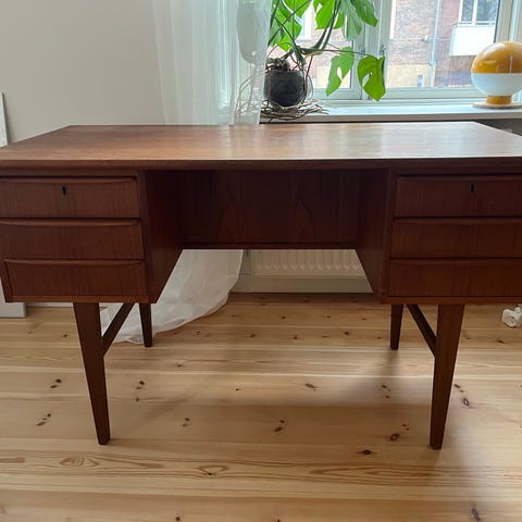 Teak skrivebord med 4 skuffer og nøgle - kan stå frit i rummet