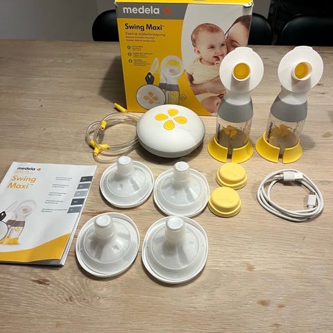Medela Swing Maxi dobbelt brystpumpe med en del ekstra udstyr (bl.a. slange som gør at den kan bruges som enkelt pumpe) og flere flasker som er helt nyt og ubrugt. Den er uvurderlig i forbindelse med opstart af amning (den får mælken til at løbe hurtigere til, da den dobbelte pumpe for kroppen til at tro den skal producere til to) og ved evt. brystbetændelse kan den hjælpe med at tømme brystet helt, så det er hurtigere overstået, eller hjælpe produktionen tilbage på rette spor, hvis betændelse har hæmmet den.