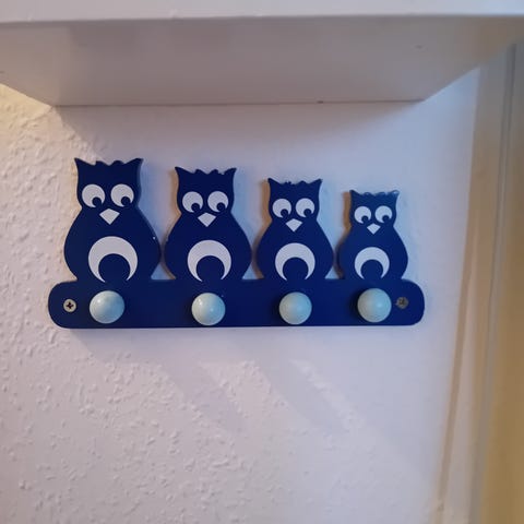 Knagerække 49 cm x 10 cm. Tre knager med forskellige uglehoveder.