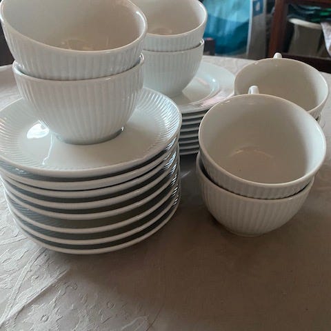 Middagstallerkener, kagetallerkener og kaffekopper med underkop. 8 stk. af hver. Hvid med sølvkant.