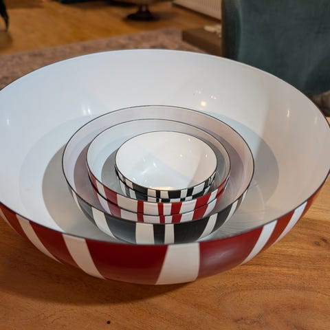 3 små skåle på et træbræt samt 1 stor skål fra Cathrineholm