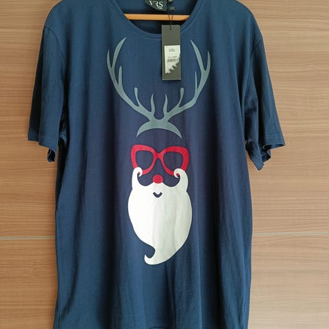 H&M VRS Man T-shirt i størrelse M med multifarvet julemotiv. T-shirten er designet til mænd og har et mønster med juletema, herunder rensdyr og juletræer. Materialet er ikke specificeret, men t-shirten er velegnet til afslappet brug.