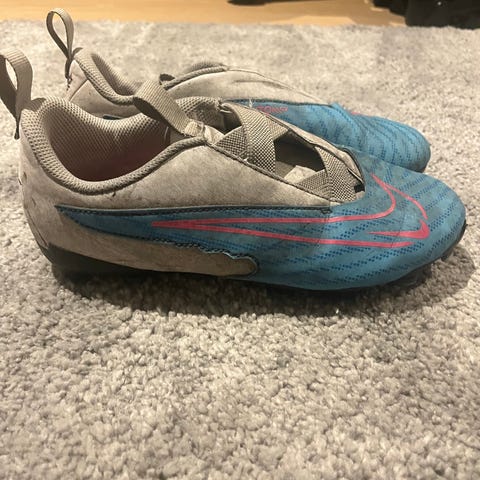 Nike Phantom Vision fodboldstøvler i blå og sort farve. Støvlerne har en strømlinet pasform med en soklignende ankelkrave for ekstra støtte. Ydersålen har knopper designet til græsbaner. Størrelse 42, egnet til herre eller unisex brug.