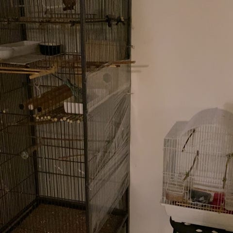 Undulater i voliere 15-16 stk til salg plus et stort indendørs bur målene står på det sidste billede