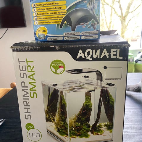 Lille akvarie til rejer eller fiske yngel. Der medfølger det som ses på billedet. Bundlag, filter og "pynt".