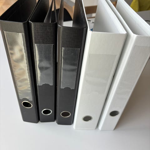 Pakke med 10 stk 35mm brede Esselte 2-rings ringbind. Jeg har 10 pakker, og de er enten røde eller blå. Har ikke åbnet alle pakkerne, så der kan være andre farver.