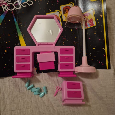 Fint intakt sæt med gine og hat med hår i hip hop style anno 90'erne . Originalt Barbie Mattel , se også mine andre annoncer med Barbie m.fl
