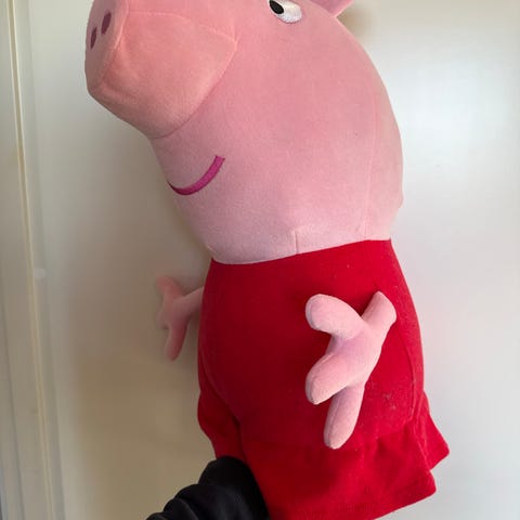 Gurli Gris bamse legetøj i blødt materiale med lyserød farve og rød trøje. Egnet som børnelegetøj.