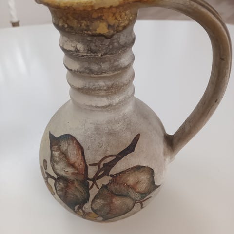 Keramik, kande, eller vase - bemalet - gammel kr 50 (billede 1)og vase med farvestrålende glasur(billede 2 ) kr 50 nu solgt og tekande flere billeder kan sendes kr 50 også med tekst under bunden se billede med en lille firkantet vase fra den KGL. porcelænsfabrik denne 300 men priser fra