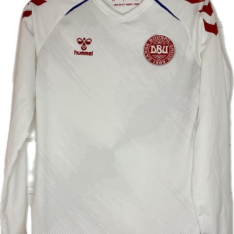 Denne model er karakteriseret af de dybe, geometriske linjer, der elegant bryder den røde flade. Hummel valgte igen at arbejde med subtile mønstre og stærke, visuelle detaljer, der understreger trøjens identitet uden at stjæle fokus fra helheden. Selvom trøjen ikke bærer et navn, repræsenterer den en tid med spillere, der satte nye standarder for dansk landsholdsfodbold – både teknisk, mentalt og taktisk.