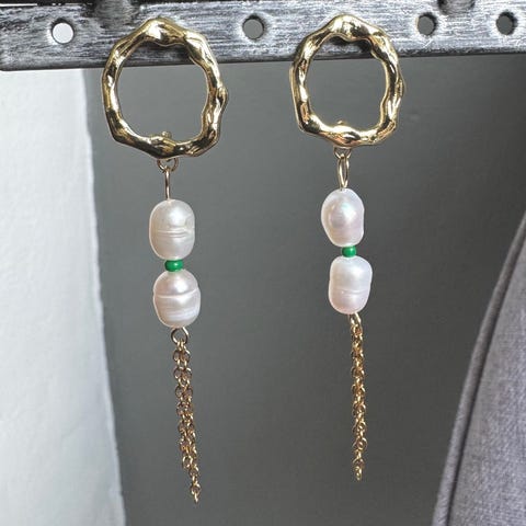 Hver ørering har 2 ferskvandsperler i høj A-kvalitet, kombineret med en fin grøn detalje og en let dobbelt anker-kæde.