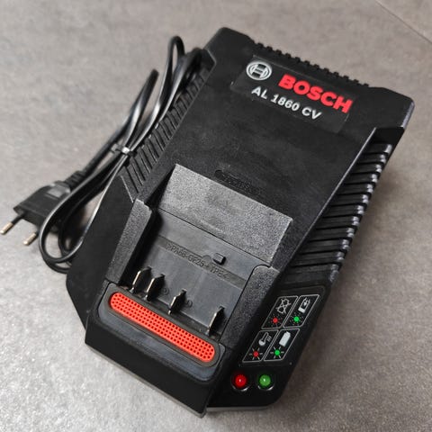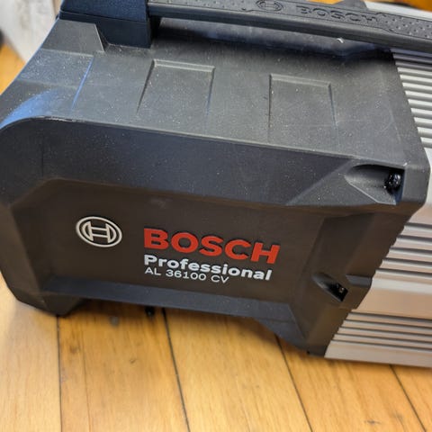 Bosch Professional batterilader med to 36V batterier. Laderen er designet til effektiv opladning af batterier til professionelt brug. Batterierne har en kapacitet på 36 volt og er kompatible med Bosch Professional værktøjssystemer.