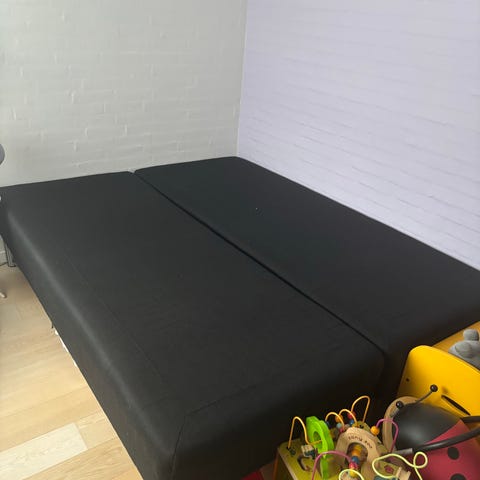 Helt ny, brugt i en lille månedstid og fremstår helt ny. Den måler 160 x 200 cm, hver madras er 80 cm i bredden. Der medfølger ikke ben, topmadrasser til hver boxmadras og en sengekile til midten hvis man ønsker madrasserne samlet. Sengehøjden er lav og velegnet til børn og voksne.