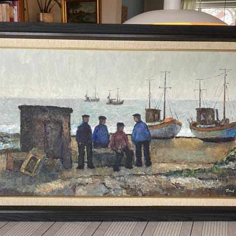 Oliemaleri, Poul Berg, motiv: Landskab, stil: Naturalistisk, b: 85 h: 40, Et dejligt maleri af Poul Berg. "Lys dag ved Tranum Strand".