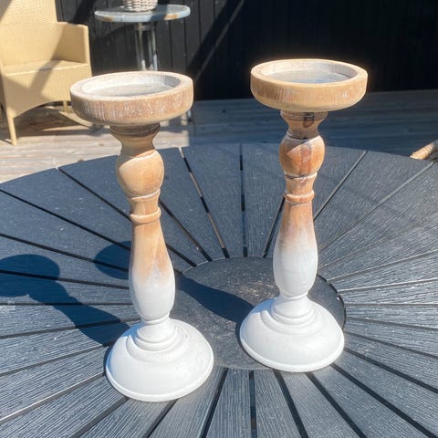 Lysestagesæt, Ukendt, Lysestager i Birketræ med 3 stk. i hvert sæt i forskellige højder. Diameteren på hver er ca. 5-6 cm og passer til almindelige fyrfadslys. Lysestagerne er designet og lavet af min far, så derfor vil det ved bestilling tage 1-2 dage før de er færdige og kan afsendes.