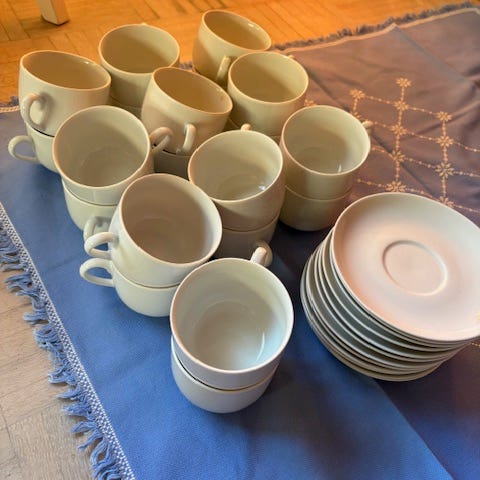 9 par hvide kopper og underkopper - kop og underkop - Pris 30 kr. for et sæt.