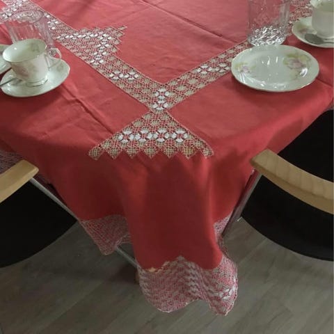 Dugen er nøje gennemgået, vasket, strøget og fundet fejlfri. En meget smuk dug!
