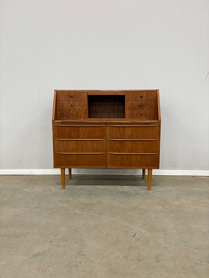 Teaktræ hjørneskab med 3 skuffer samt to låger med barskab