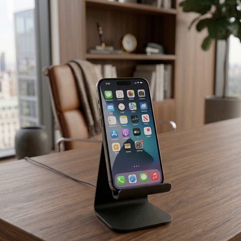 Universal holder til mobiltelefon i sort plastik. Holderen har en rund åbning øverst til greb og en flad bund, der kan støtte en telefon i oprejst position. Egnet som simpelt stativ til at placere en mobiltelefon på bord eller anden plan overflade.
