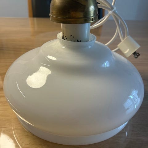 Skomager Pendel i rødt 2 lags opalglas,med dekorationer,ophæng i bruneret messing,monteret med ny sort stofledning.