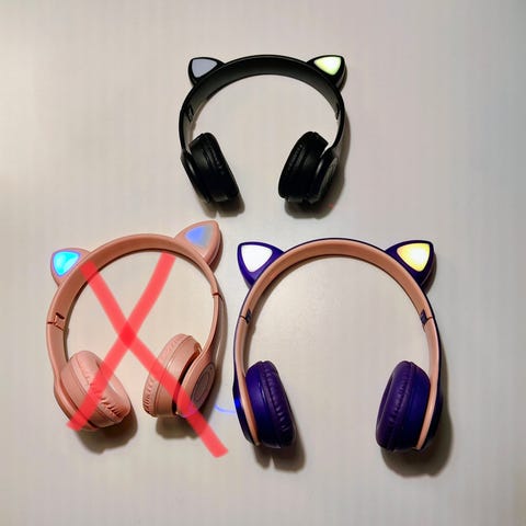 Disse billeder viser et par blå børnehovedtelefoner med polstrede ørepuder. Hovedtelefonerne har et justerbart pandebånd, og der er små illustrationer og logoer på siderne af ørekopperne. Der er knapper til kontrol af Bluetooth og volumen, samt en port til tilslutning. Ørekopperne har et diameter på 16 cm.