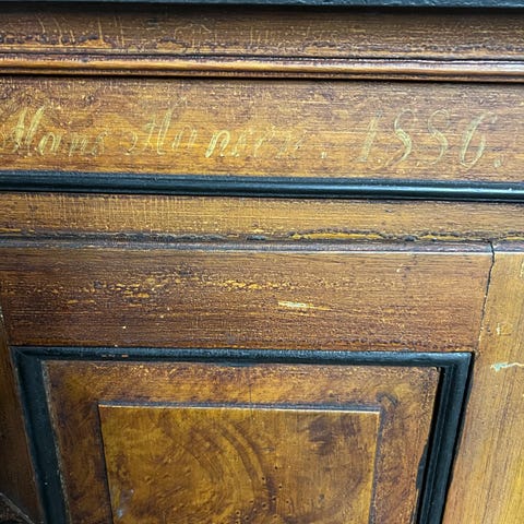Massivt træ og charmerende patina. Låger og skuffer fungerer fint.