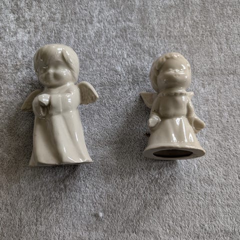 2 engle lyse stager, motiv: engle, 2 store og høje fine engle lyse stager,er 16 cm høje og 10 cm brede, med guld kanter på, 60 kr for 2 stk