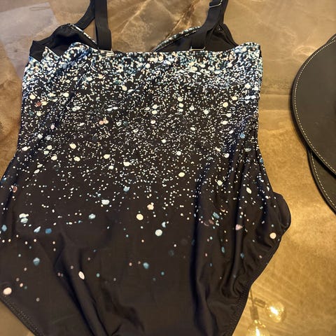 badedragt til kvinder i størrelse L med sort, hvid og mønstret design. Badedragten er egnet til svømning og er fremstillet af materialer tilpasset vandsport. Dobbeltlag
