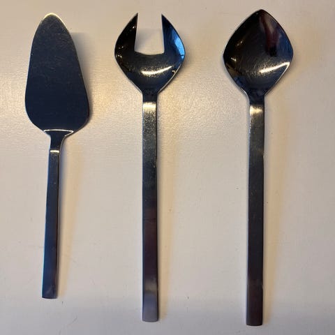 Velholdt bestik, 15 middagsskeer og 1 middagsgafel sælges. Rustfrit stål, alle børstet stålboryset fra en enkelt spiseske som har blankt skaft. I alt 16 dele.