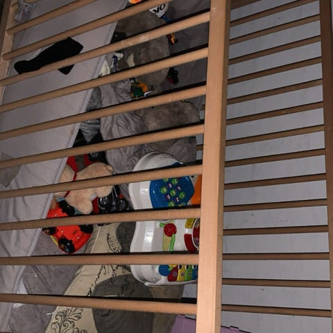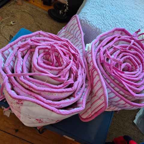 Tilbehør til børneseng i lyserød farve med polstret velourmateriale. Hovedgærdet har en form som en muslingeskal og er designet til børneværelser.