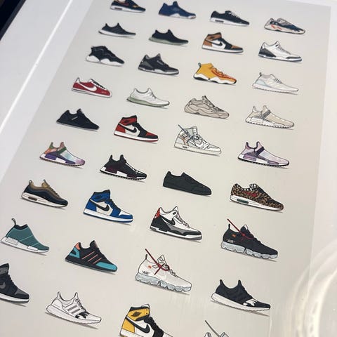 Nike Air Jordan 1 High sneaker print featuring a colorful, abstract design. The artwork depicts the iconic high-top sneaker with a multicolor palette including red, yellow, blue, and green tones. The print highlights key design elements such as the Nike swoosh, laces, and sole details in a stylized, geometric art style.