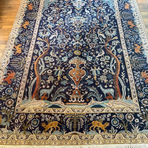Mål 3,45x2,25. Uld på bomuld. Ikke slidt og meget velholdt. Har altid ligget i et røg- og husdyr frit hjem.