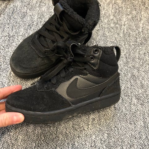Nike børnesko til dreng i størrelse 40. Skoene er sorte og har en varm, foret inderside, der kan give ekstra komfort og varme. Sålene har et rundt mønster for greb. Materialet fremstår som ruskind eller lignende tekstur.