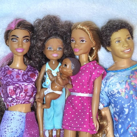 Barbie simba dukker med mor og far og mange børn. Moren har også barn i maven som kan tages ud. Der medfølger barnevogn og klapvogn. Sender gerne via dao på købers regning.