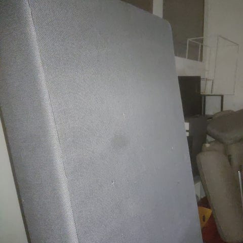Jysk sengebund med ben, mål 90x200 cm, betrukket med gråt stof. Passer til enkeltseng og kan anvendes som underlag for madras. Benene er faste og giver stabil støtte.