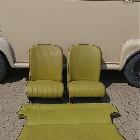 Sæder fra Fiat 126, ny polstret, har siddet i en Fiat 600 og passer muligvis også i en 500 eller 127, men tjek billede af skinne, om den passer i din bil.