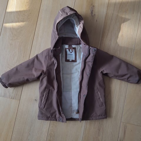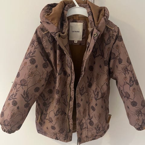 Lil'Atelier børnejakke i størrelse 98. Jakken er brun og har en hætte. Den er foret indvendig og er ekstra varm.