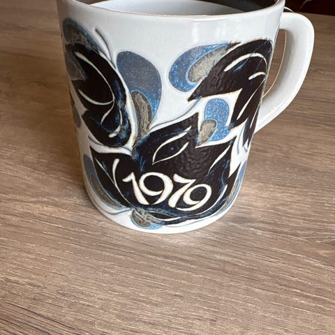 Royal Copenhagen 1975 porcelæn fad med dekorative motiver af skibe og bylandskaber. Fadet har guldkant og er rund i formen. Det er fremstillet i porcelæn og er en del af en serie hvor der blev lavet 2500 stk. Motiverne er malet i bløde farver med detaljer i guld.
