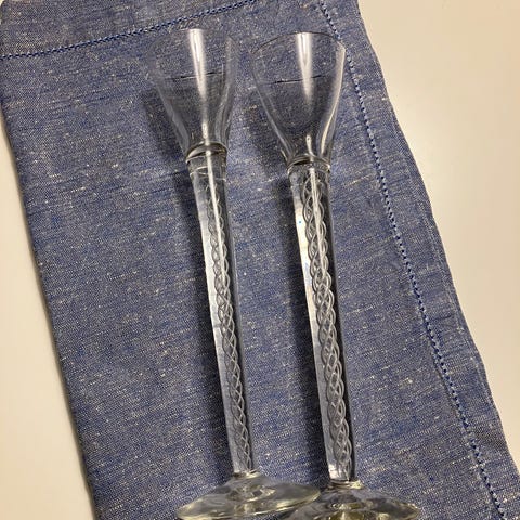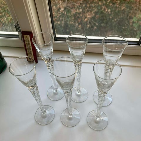 12 smukke, elegante og høje snapseglas fremstillet i svagt grønt glas med spiral i stilken.