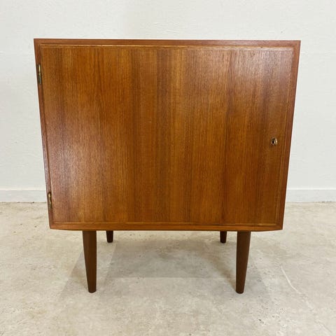 Dansk 1970" Design / POUL HUNDEVAD skab i teaktræ med mål på 180 cm i højden og 100 cm i bredden. Skabet har to øverste skydedøre, en åben hylde i midten samt to nederste skydedøre. Designet inkluderer flere hylder til opbevaring. Farven er naturlig teaktræ. Velegnet til opbevaring i hjemmet