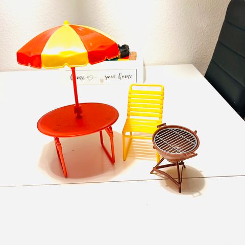 Barbie outdoor sæt med havebord, grill, havebænke, solseng og hest der vrinsker.