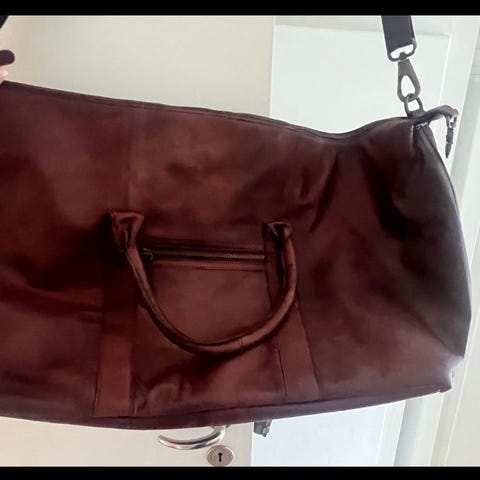 Weekendtaske, Rejsetaske/weekendtaske i sort læder med remme der kan bæres over en skulder som en shopper og lang rem til at bære den på tværs af ryggen. God stand, brugt få gange. Med indvendige små rum og et lille lynlåsrum. Tasken lukkes med lynlås og har også et lynlåsrum på bagsiden til pas, pung, mobil etc. Under bunden er der metaldutter, så den ikke bliver beskidt/slidt, når man stiller den på jord/underlaget.