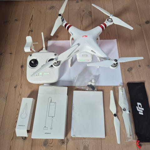 DJI Phantom 3 drone i hvid farve, leveres med fjernbetjening og transporttaske. Dronen har fire propeller og er designet til luftfotografering og videooptagelse. Transporttasken giver beskyttelse og nem opbevaring af drone og tilbehør. Stand. Total ukendt. Der for os prisen og mangler lader fast pris