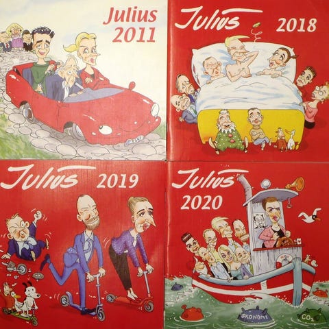 Humor og satire. 6 hæfter med Julius' tegninger. Der er tale om årshæfterne fra 2002, 2003, 2004, 2007, 2008, 2009.. Hæfterne er i pæn stand. Prisen er den samlede rabatpris for alle 6 hæfter. Skriv en besked, hvis der kun ønskes køb af enkelte af hæfterne. Sendes gerne. Køber betaler porto.
