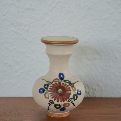 Keramik, Vase, Danmark, 18 cm høj keramikvase med grå glasur og malet blomstermotiv forpå.