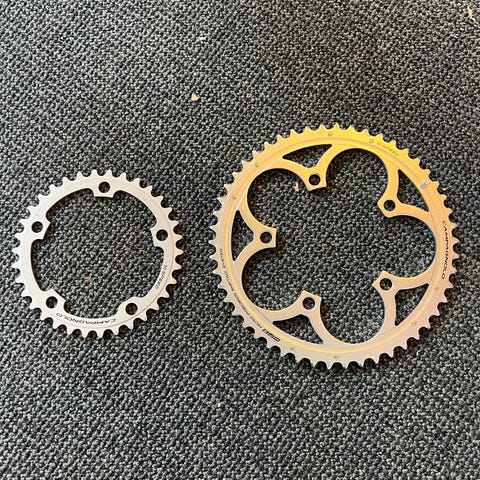 Klinge, Campagnolo Super Record, Campagnolo Super Record klinge, 53 tænder, sælges. Kun lidt brugt og stadig med den originale emballage. BCD er 144 med en boltafstand på 84,6 mm. Kan sendes for + 50 kr. ved forudbetaling