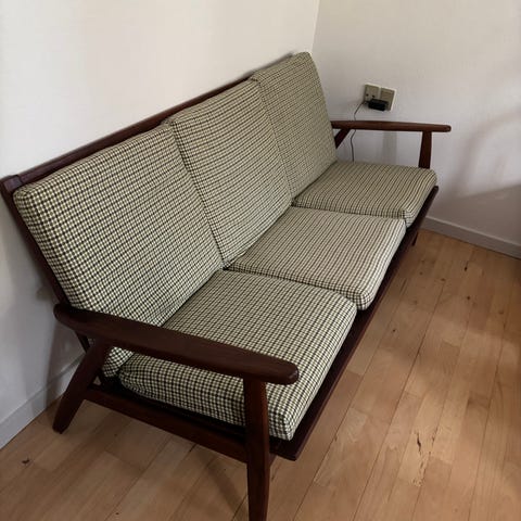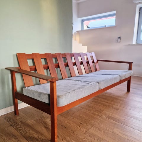 Smuk 3 personers sofa med stel i teaktræ og læderhynder (med brugsspor)