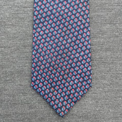 Silkeslips. Slipset har en farvekombination af rød og blå med et gentaget mønster. Materialet er silke, og den er designet til mænd.