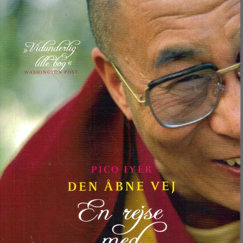 Pico Iyer Den Åbne Vej bog. Dansk udgave af 'The Open Road' fra 2008. Udgivet af Kristeligt Dagblads Forlag, København. Indeholder en fortælling om forfatterens oplevelser med Dalai Lama, baseret på en rejse og personlige erfaringer.