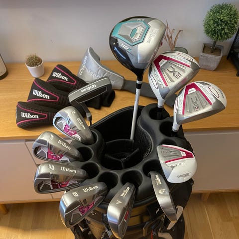 Super stand – komplet Wilson kvindesæt med lette, tilgivende jern, driver, 3+5-wood, 5-hybrid og putter. Klar til banen med stand bag, regnslag & rejsecover! Pris // 2495,-